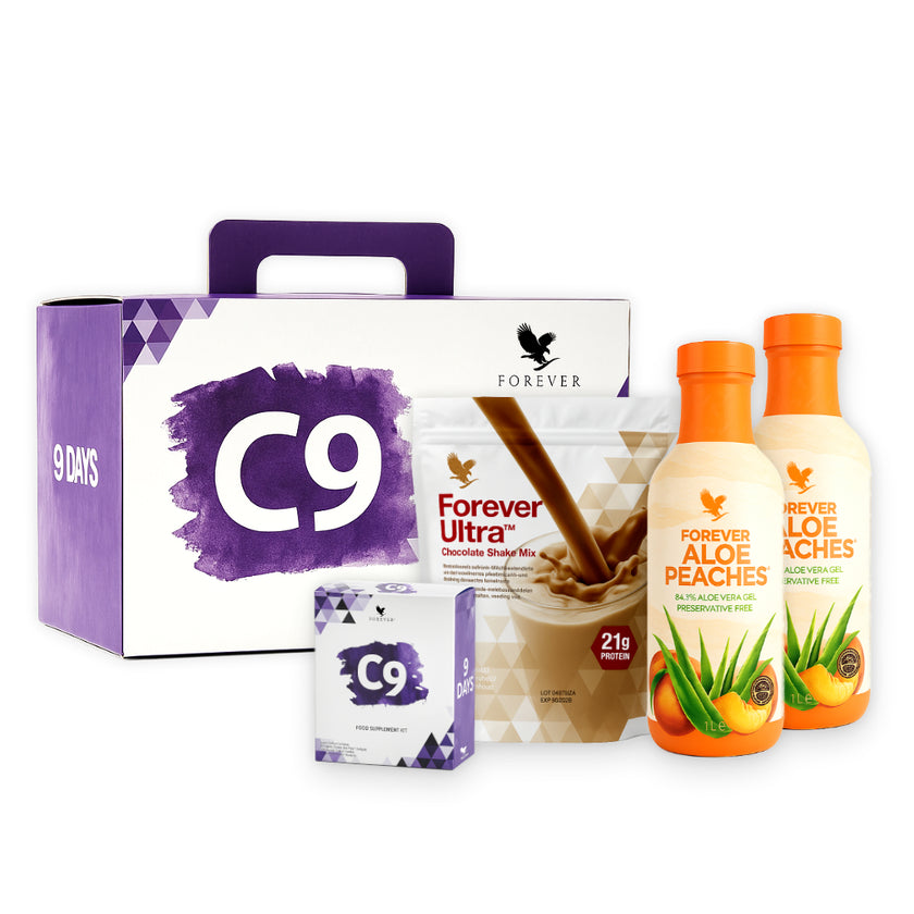 Forever Clean 9 – Peaches Chocolate ist ein Komplettset mit Aloe Vera Gel, Shake und ergänzenden Produkten. Enthalten sind Getränke, Kapseln, Ballaststoffe sowie ein Booklet mit einem strukturierten 9-Tage-Plan.